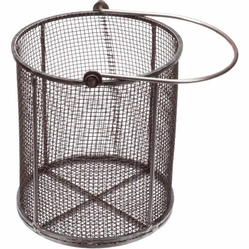 Round material handling basket with handles and wire mesh that has four openings per linear inch. This round basket design can accommodate many types of parts. Ideal for parts washing, cleaning, degreasing, ultrasonic cleaning, curing, and materials handling applications. The basket has handles for ease of manual handling. Each basket is designed to stack so parts do not get crushed. 100% USA Made.