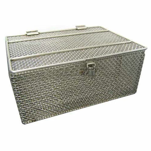 Stainless Steel material handling parts washing basket with a lid and hinge. Constructed with four mesh openings per linear inch. Rugged construction ensures basket longevity in applications such as dipping, cleaning, or moving components in industrial settings. 100% USA made.