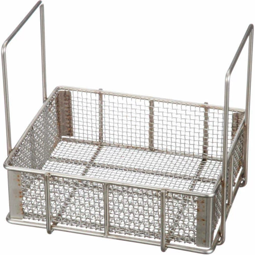 Material handling basket with handles and mesh that is four openings per linear inch. Rectangular Basket. Robust USA Made Quality. Ideal for washing parts, parts degreasing, ultrasonic cleaning, curing, and materials handling in a variety of applications such as chemical bath, heat treating, and cryogenics. The baskets have handles for easy gripping. Each basket stacks so that parts do not get crushed inside the basket. 100% USA made.