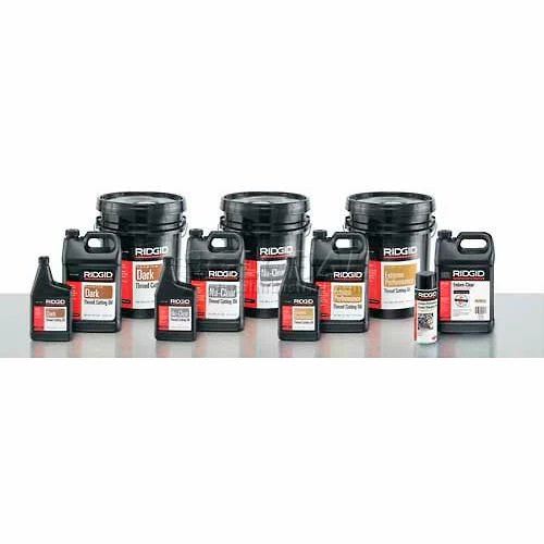RIDGID thread cutting oils are free of chlorine and other halogens, PCBs and heavy metals. Complete material safety data sheet available. Endura-Clear™ is specially formulated to maximize wear resistance which increases die life up to 60% and significantly cuts operating costs up to 30% over Nu-Clear. The formulation has been tested to assure chemical compatibility with FlowGuard Gold®, BlazeMaster®, and Corzan® pipe and fittings and has been added to the FBC™ System Compatible Program. Dark Oil ‘ Traditional mineral oil with low odor and anti-mist formulation. Nu-Clear® Oil ‘ Clear mineral oil with low odor and anti-mist formulation. Special low temperature properties maintain workable viscosity to -20°F. Extreme Peformance Oil ‘ High performance mineral oil formulated to produce superior quality threads on stainless steel and black pipe. FBC™ System Compatible indicates that this product has been submitted by the manufacturer and is monitored on an ongoing basis to assure its chemical compatibility with FlowGuard Gold®, BlazeMaster® and Corzan® pipe and fittings. The manufacture also agrees not to change the product after passing the test “FBC™. FlowGuard Gold®, BlazeMaster®, Corzan®, and FBC® are licensed trademarks of the Lubrizol Corporation. Features Cools threads and pipe during operation. Speeds metal removal. Improves thread quality. Reduces threading torque.